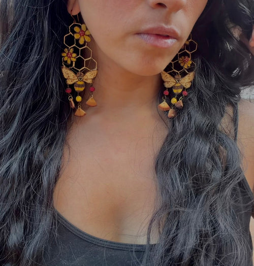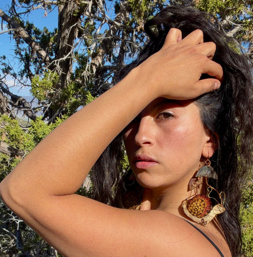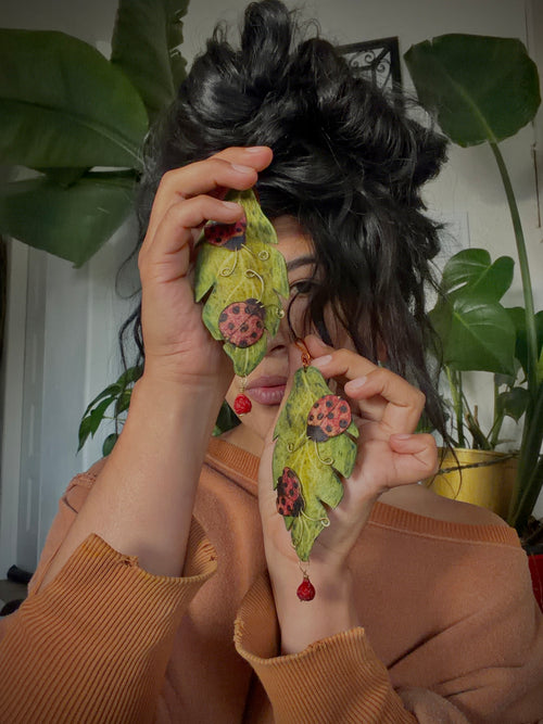 Ladybugs carry so much magic in their little body. In my case, and I know for many people, they have shown up in many moments out of nowhere as if they knew I was needing a mystical companion or answer. In their honor, I created these earrings which are crafted with mango pits. I painted the leaves with a combination of plants like tarragon, matcha and spirulina. The ladybugs are painted with beets and turmeric. And the lovely red drop is a rose hip reminding us of the good work they do as pollinators, although is uncommon to hear about it. As I am not wanting to use any epoxy resin or toxic gloss, I have polished them by hand with oils and wax until the color stayed.